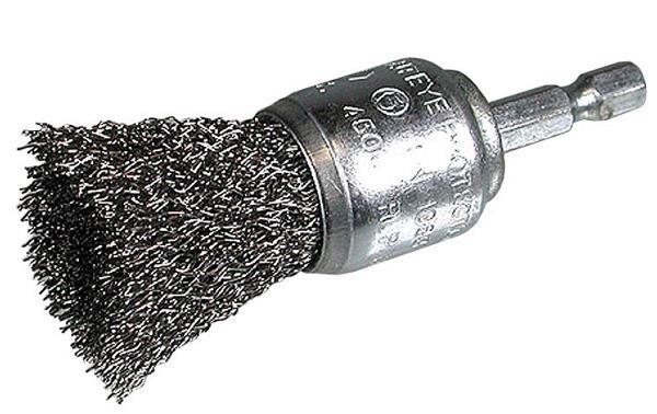 En penselbørste med krympede tråder, som gjør den perfekt til grov rengjøring og fjerning av maling, lakk, rust, og lignende. Vanlig 1/4" sekskantfeste, som gjør at den passer vanlige batteridriller.