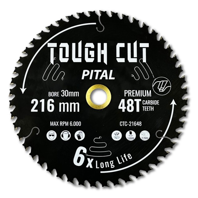 Pital Tough Cut 219mm sirkelsagblad med 48 høykvalitets tenner i karbid. Perfekt for presise og rene kutt i tre og komposittmaterialer. Senterhull 30mm.
