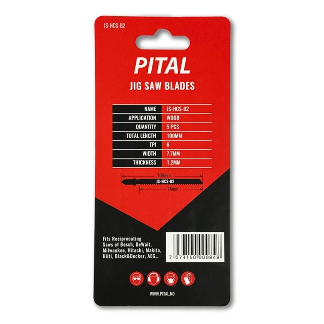 Pital stikksagblad for tre er 100mm langt, og har en tanntetthet på 6 TPI. Bladet er laget av slitesterkt HCS-stål, og er spesielt designet for å gi raske og rene kutt i treverk. Ideelt for både hobbybrukere og profesjonelle. Bladet kommer i 5-pakning, og er kompatibelt med de fleste stikksager.