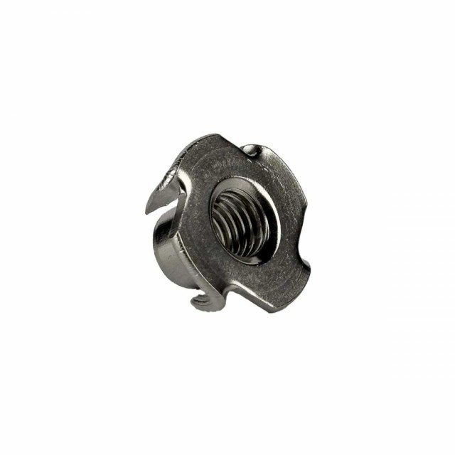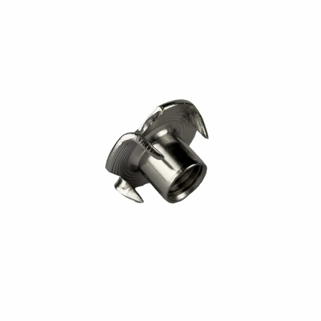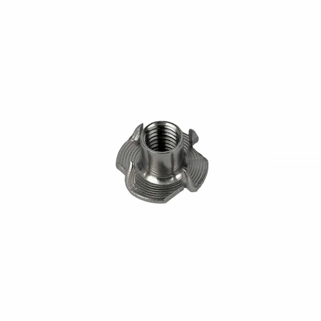 Islagsmutter/Innslagsmutter med innvendige metriske gjenger og fire tenner, for å låse mutteren. Mutteren bankes ned i et forboret hull fra baksiden, og kan brukes til montering av f.eks. møbler, kasser, hyller, og lignende. Produsert i korrosjonsbestandig rustfritt A2-stål.