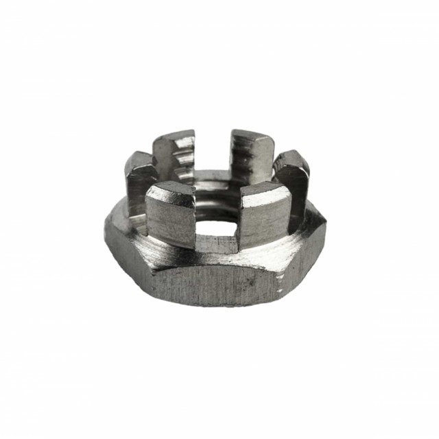 Syrefast, lav kronemutter, produsert i A4-stål, for sikring av bolter med splint eller sikringspinne. Forhindrer løsning ved vibrasjoner. Egner seg bra i korrosive miljøer, i nærheten av kjemiske stoffer, fukt, saltvann, og lignende. Mutteren følger DIN979-standarden.